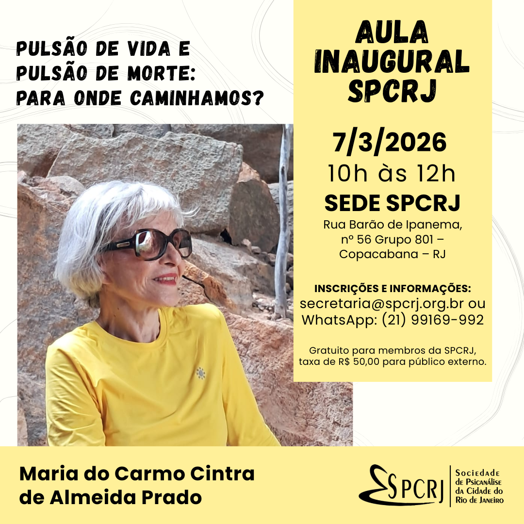 Dia 7/3/2026, das 10h às 12h com Maria do Carmo Cintra de Almeida Prado, Doutora em Psicologia Clínica (PUC-Rio). Possui anos de experiência como Psicóloga do IP/UERJ na UDA de Psiquiatria do HUPE, coordenando os setores de Psicodiagnóstico Diferencial e Terapia de Família. Membro efetivo, didata e docente da SPRJ. Membro aderente da APAOR.
