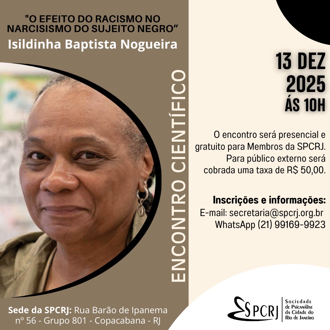 A psicanalista Isildinha Baptista Nogueira é a palestrante convidada do Encontro Científico da SPCRJ no sábado dia 13 de dezembro de 2025 às 10h com apresentação sobre o tema: O Efeito do Racismo no Narcisismo do Sujeito Negro.